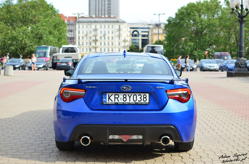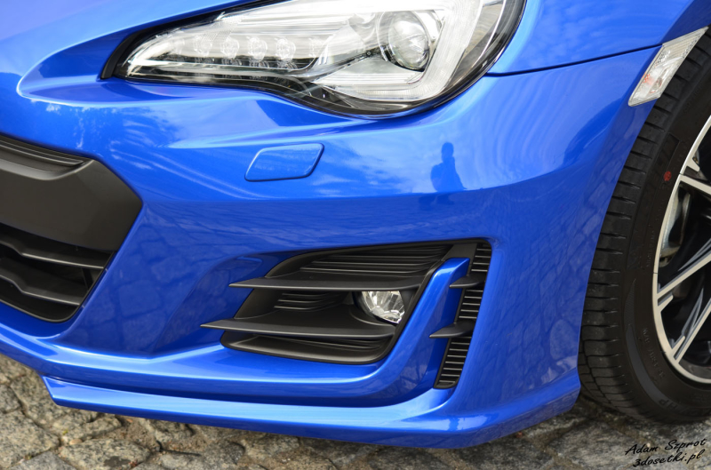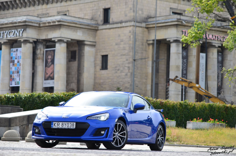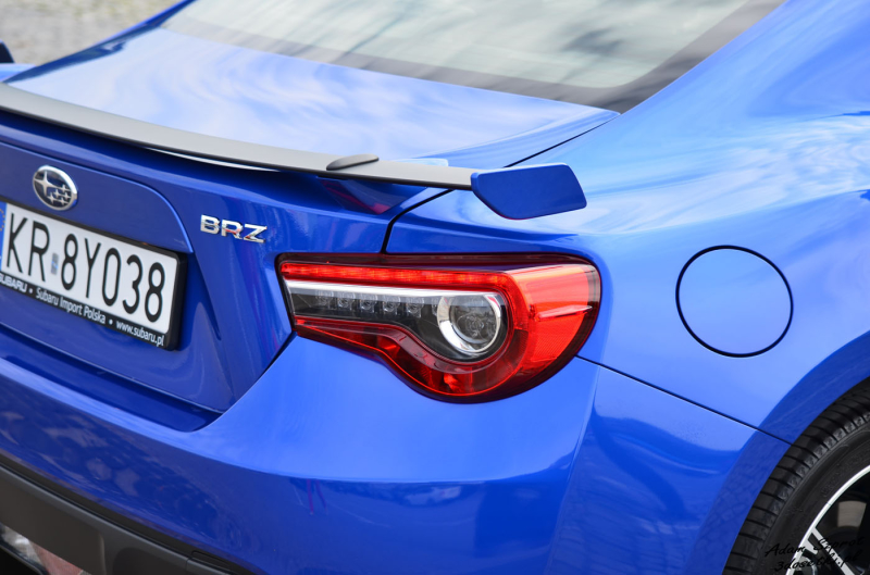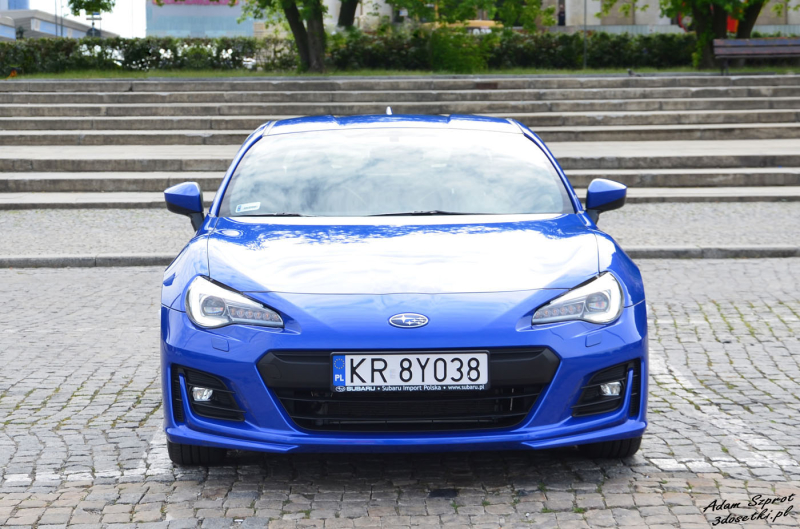 Niektórzy twierdzą, że człowieka można ocenić po pierwszych 7 sekundach. Wiadomym jest, że poddając auto takiej próbie, ocenić można tylko jego zewnętrzną formę. Stając przed salonem Subaru w Krakowie, gdzie odbierałem BRZ do testu, ujrzałem samochód jak kroplę kształtną i niebieską do tego, bo w kolorze WR Blue Pearl.Przyczajone, choć nieagresywnie stylizowane z przodu auto, ostrzej przyprawione z tyłu – chyba za sprawą spojlera, z pewnością za sprawą solidnych, chromowanych dwóch rur, kończących układ wydechowy. Patrząc z boku, rzuca się w oczy harmonijna i lekka linia, wykreślona maską, słupkiem, dachem i tylną szybą. Zwraca uwagę, w idealnych proporcjach trójkątne okienko, domykające formę. 7 sekund minęło, trzeba chwycić za klamkę i wejść do środka…
