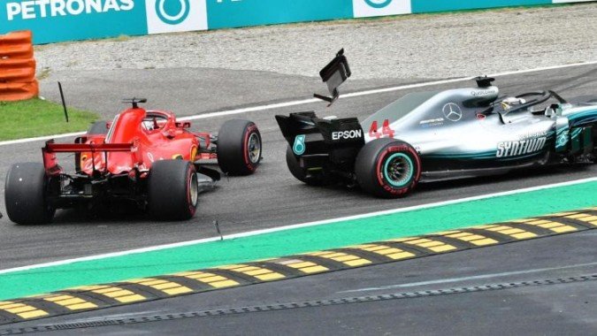 Raikkonen po pierwszej szykanie utrzymał pozycję lidera, jednak Vettel uwikłany w walkę z Hamiltonem nie wyszedł idealnie z Rettifilo i w kolejnym szybkim łuku Hamilton schował się tuż za Niemcem, by wyskoczyć obok niego na wejściu w następną szykanę Variante della Roggia. Lewis zaatakował po zewnętrznej. Vettel nie zmieścił się w zakręcie lub celowo próbował jeszcze nieco wypchnąć Brytyjczyka. Tak, czy siak skończyło się na kontakcie i obrocie Vettela, połączonym ze spadkiem na koniec stawki. Marzenia o zwycięstwie Sebastiana i dublecie Ferrari legły w gruzach już na czwartym zakręcie wyścigu.
