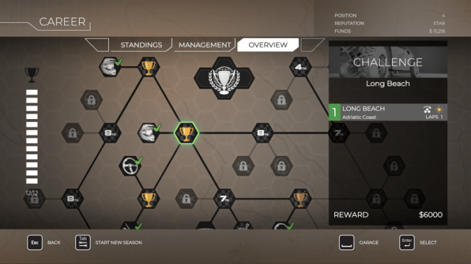 W Overpass możemy bawić się w trybie pojedynczej próby, własnych mistrzostw, multiplayerze oraz oczywiście możemy rozegrać karierę. Ta podzielona jest na 12 rund, po których cała stawka mistrzostw dzielona jest na "finał A" i "finał B", który rozgrywa między sobą walkę o główne trofeum sezonu. Sama kariera ma dość nieliniowy przebieg i zawsze mamy wybór jaką imprezę rozegrać jako następną. W dodatku zajmowanie dobrych miejsc odblokowuje nowe ulepszenia naszego sprzętu, a także gadżety jak nowy ubiór kierowcy. Poza tym mamy jeszcze kontrakty sponsorskie i dodatkowe wyzwania, więc jest tego trochę.