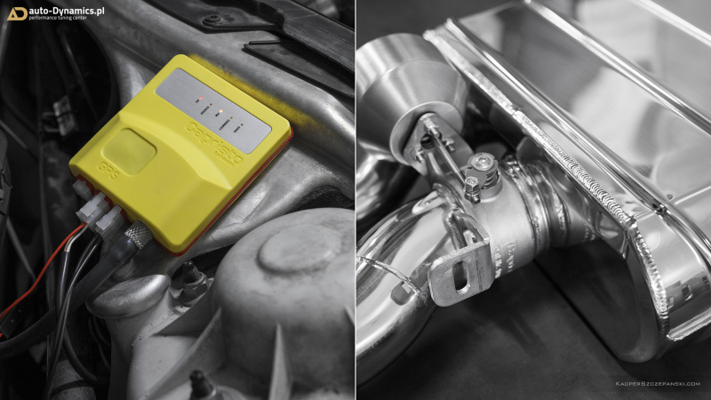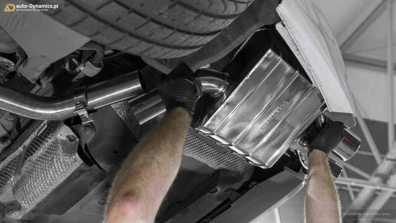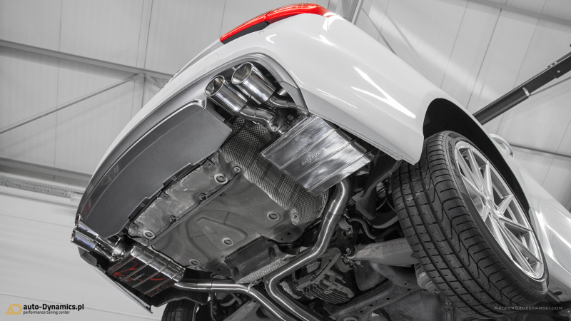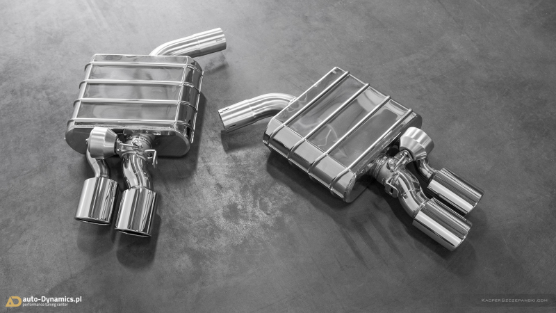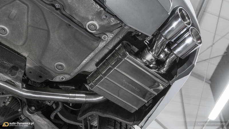 Strojenie słyszalności szalenie instrumentalnej V-Ósemki przeprowadziliśmy bez użycia kamertonów. Podczas eskalacji brzmienia posłużyliśmy się wybitnie dostrojonym dźwiękowo, profesjonalnym a zarazem sportowym układem wydechowym od legendarnej i ekskluzywnej, renomowanej niemieckiej manufaktury – atelier Capristo. Kompletacja zainstalowanego przez auto-Dynamics.pl zestawu to para tłumików końcowych z owalnymi, perfekcyjnie prezentującymi się końcówkami wraz z zaimplementowanym systemem podciśnieniowych zaworów / przepustnic odpowiadających za wybór poziomu natężenia akustyki – w sposób zdalny, za pomocą wygodnego pilota oraz wysoko przepustowa sekcja centralna wymeldowująca fabryczny tłumik środkowy z fonetycznej pięciolinii. Całością nowo zainstalowanego układu wydechowego zawiaduje w pełni cyfrowa, zaawansowana jednostka sterująca CES-3, pozwalająca na pełne dostosowanie intensywności brzmienia do aktualnie panujących warunków i potrzeb a bieżąco wybrany status prezentowany jest czytelnie na wyświetlaczu radia samochodowego [za pomocą RDS]. Definiując cechy charakterystyczne systemu Capristo - spokojny podczas długich, autostradowych podróży lub potężna, gardłowa akustyka V8 [4.0 TFSI] która zadowoli nawet najbardziej wyszukane preferencje motoryzacyjnych audiofilów. Dodatkowe aspekty na plus to bez wątpienia: znaczna redukcja masy oraz przyrost mocy i wzrost momentu obrotowego. Niemożliwym do pominięcia jest również fakt nadania niebywale agresywnej, w dalszym ciągu OEM'owej aparycji tylnej części pojazdu dzięki fenomenalnie zaprojektowanym i wykonanym końcówkom. #TopHighEnd by #AD