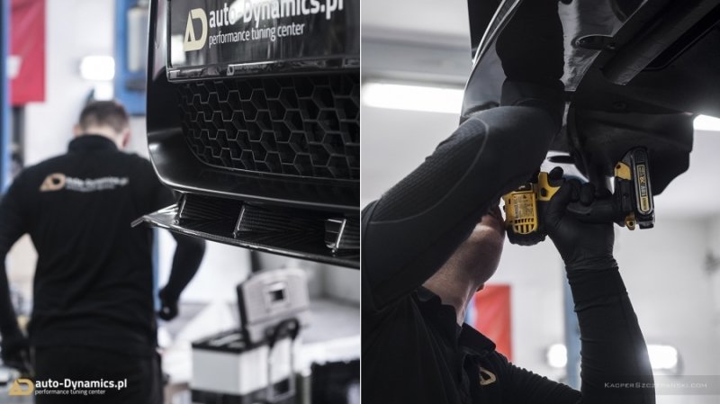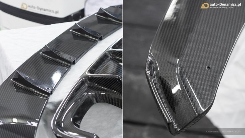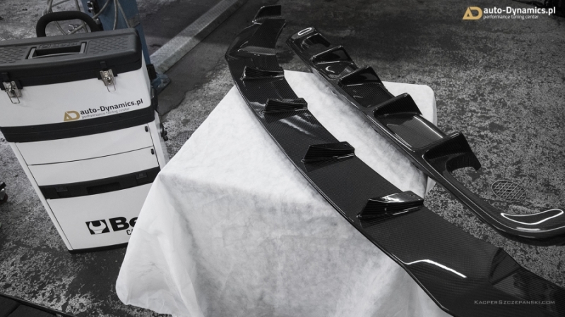 Realizując ściśle określone założenia projektu, pierwszy etap prac koncertował się na wyposażeniu BMW w wykonane w całości z niczym niedomieszkowanego włókna węglowego [pre preg carbon] elementy w postaci aerodynamicznego spoilera zderzaka przedniego, cechującego się ciekawym designem, zakończonym ekstremalnie dobrze wyglądającymi winglet’ami oraz w koherentnym stylu dyfuzora zderzaka tylnego który zapewnia stylistyczną fuzję z frontową dokładką a jednocześnie idealnie współgra z karbonowo-tytanowymi końcówkami układu wydechowego Akrapovič. Oba elementy aero-kit’u pochodzą od renomowanego, niemieckiego tunera specjalizującego się w modyfikacjach pojazdów marki BMW – firmy Manhart Performance. Jakość wykończenia, splot włókna karbonizowanego oraz spasowanie – są absolutnie i bezspornie powalające a ich stylistyka redefiniuję bryłę pojazdu, przenosząc odbiór jej kształtów na nowy, wyższy poziom. Dodatkowo własnym zapleczem technicznym wykonaliśmy adaptację dyfuzora zapewniającą kompatybilność elementu z fabrycznym, elektrycznie sterowanym hakiem BMW.