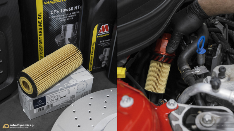 Skuteczna recepta zapewniająca perfekcyjną kondycję i długowieczną sprawność eksploatacyjną zmodyfikowanego na ponad 535KM pojazdu to częstsza dbałość o intensywniej użytkowane podzespoły mechaniczne auta. W auto-Dynamics.pl otaczamy profesjonalną opieką serwisową każdy pojazd w którym mieliśmy sposobność czynić mniejsze lub większe modyfikacje, a goszczący u nas CLA45 AMG stanowi idealny casus konstatujący przywołane fakty. W zaciskach 45'ki zagościły ultra wydajne, sportowe klocki hamulcowe z serii RSL [mieszanka RS29] niemieckiej firmy Pagid Racing, które współpracować będą z wcześniej zainstalowanymi przewodami hamulcowymi w stalowym oplocie [niemieckiej firmy Fischer Hydraulik] oraz wyczynowym płynem hamulcowym marki Millers. Zestaw elitarnych klocków Pagid Racing kooperować będzie z nowymi, wentylowanymi, nacinano-nawiercanymi tarczami AMG. Konglomerat wszystkich zainstalowanych podzespołów przeistacza fabryczny system hamulcowy w niezawodne, maksymalizujące poziom bezpieczeństwa narzędzie którego praca przekłada się bezpośrednio na gwarancję spokoju, zarówno kierowcy jak i pasażerów. System perfekcyjnie sprawdzi się również podczas dynamicznej, agresywnej jazdy oraz okazjonalnych Track Day’s. Korzystając z obecności „Styks’a” w auto-Dynamics.pl, współbieżnie z modyfikacjami a uwzględniając interwały konserwacyjne, w AMG przeprowadziliśmy dodatkowo pełen profesjonalny serwis olejowy z wykorzystaniem zaufanych i niezawodnych olei Millers, które znacznie przewyższają zadane przez stuttgarcką fabrykę normy. Rzędowa jednostka napędowa zapełniona została wysokiej klasy olejem z serii Motorsport, o specyfikacji 10W60 – CFS z NT+ w połączeniu z OEM filtrem MB. Biorąc pod uwagę wszelkie dyrektywy Mercedes-AMG, w silniku „Styks'a” zawitał ponadto zestaw nowych, oem’owych świec zapłonowych a uwzględniając jednocześnie wcześniej przeprowadzone, mechaniczne modyfikacje, całkowicie oczyściliśmy i zakonserwowaliśmy wieczysty, ultra wydajny filtr powietrza goszczący w karbonowym układzie dolotowym AMS Alpha. Dopełniając metodykę oraz ścisłość reguł przeglądu, w CLA45 przeprowadziliśmy całkowitą, zaawansowaną diagnostykę komputerową [przy pomocy najnowocześniejszego oprogramowania firmy TEXA] oraz wszelkie wymagane adaptacje i regulacje. Wszystkie wykonane czynności przeglądowo-serwisowe, przy zachowaniu szczegółowych procedur i wytycznych Daimler AG oraz naszych wewnętrznych, wyśrubowanych standardów dla pojazdów przez nas zmodyfikowanych – gwarantują bezawaryjną i bezproblemową eksploatację pojazdu o zwiększonej mocy przez kolejne dziesiątki-tysięcy kilometrów.