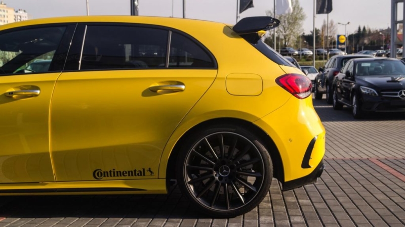 AMG A35 szczególnie wyróżnia się z tłumu w jaskrawo żółtym kolorze – nie wymaga dopłaty. Skądinąd idealnie pasuje on do sylwetki i charakteru tego samochodu. Najłatwiej odróżnić standardową A klasę od wersji AMG po tylnej części auta. A35 ma zderzak z dyfuzorami oraz charakterystyczny spojler. Znajdziemy tu również dwie końcówki układu wydechowego. Są to jednak elementy pakietu aerodynamicznego AMG, który koniecznie musimy dokupić, konfigurując ten samochód. Poza wyglądem zewnętrznym różnią się one tym, co pod karoserią i nie mam tu na myśli, tylko silnika.