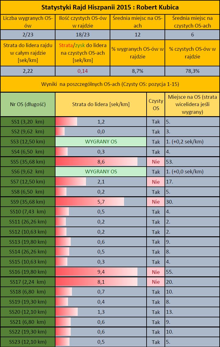 Po wielu rajdach w tym sezonie mogłem napisać, iż widać, że Robert Kubica uczynił ogromny postęp, miał dobre tempo i nie przełożyło się to na ostateczny wynik. Nigdy jednak nie było na to tak mocnych dowodów jak teraz. Zwrócił na to uwagę Lux Perpetua, który w tym sezonie przygotowuje statystyki podczas rajdów i jest w nich lepiej zorientowany niż ja.