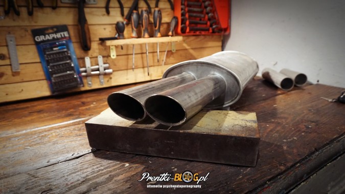 Podwójna puszka przelotowa, nowy odcinek biegnący od tłumika środkowego i dwie cięte pod kątem końcówki z kwasówki – powinno być dobrze.