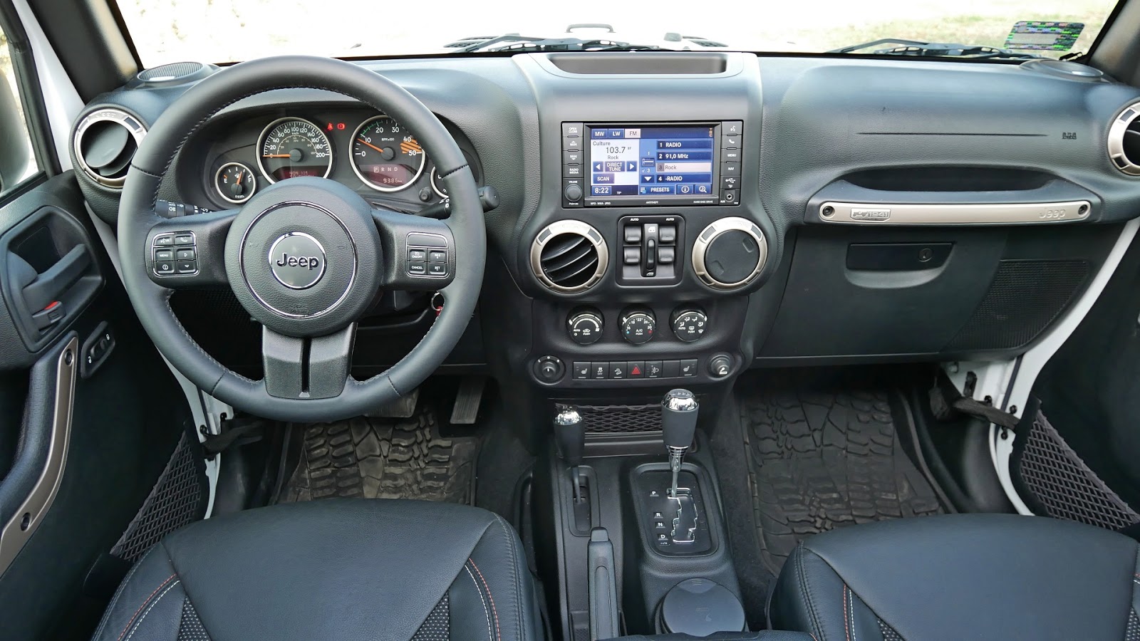Za głowami pasażerów źródło światła a przy stopach delikatny tunel środkowy i gumowy dywanik, który wygląda jakby przejechał po nim inny Wrangler. W tym miejscu znajdziemy także pojemniki na kubki oraz sterowanie elektryczne tylnymi szybami. Niezależnie od miejsca zajmowanego miejsca, zarówno przy kolanach jak i nad głową wolnej przestrzeni nie brakowało, a przypomnę, że do małych osób nie należę i mam 185cm wzrostu.