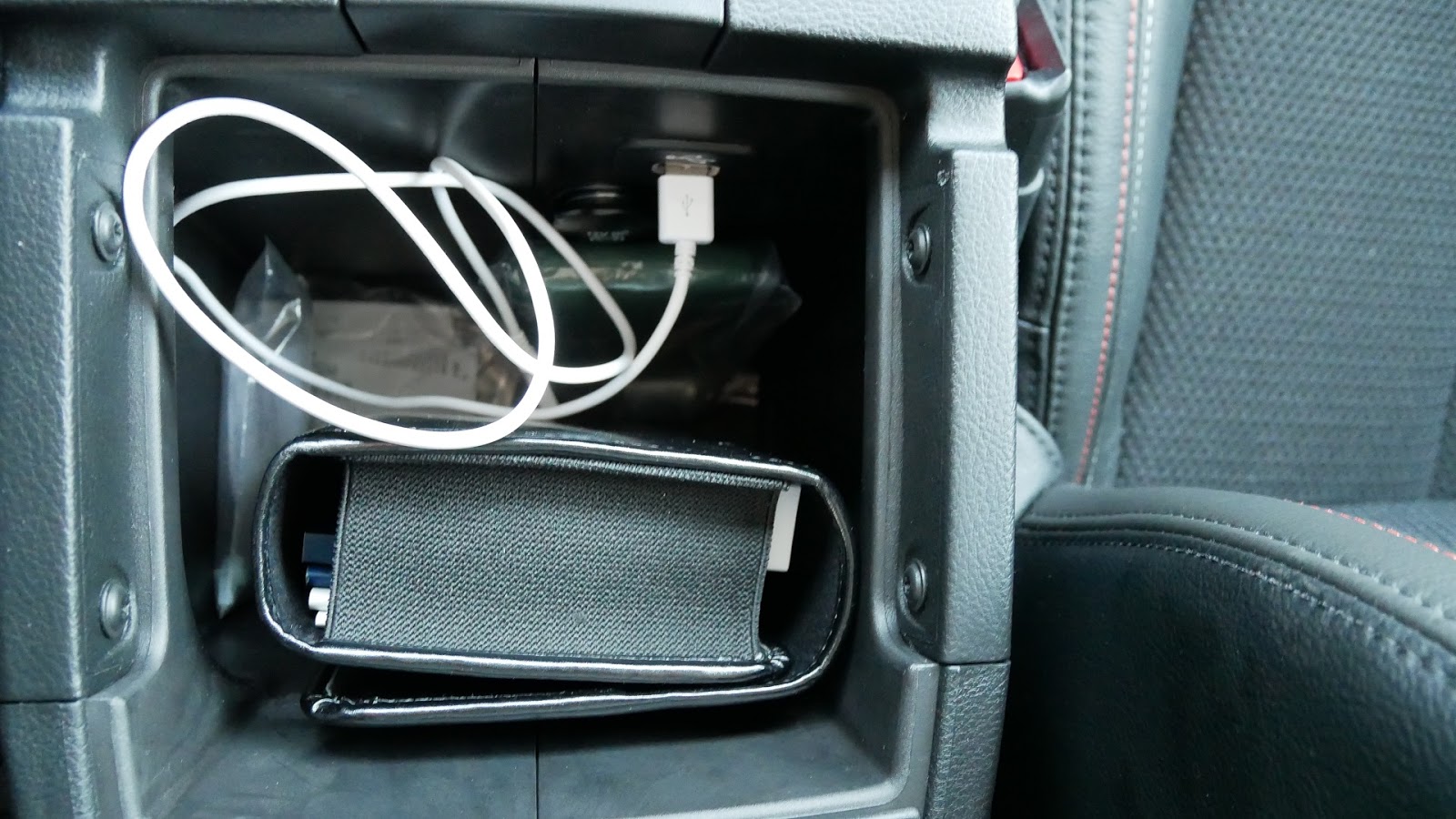 W podłokietniku jest spory schowek z podwójną skrytką w której znajdziemy wyjście 12V i USB.
