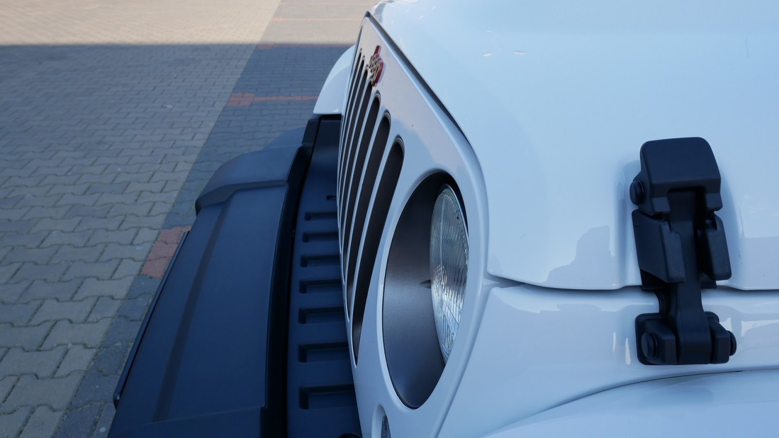 Najbardziej charakterystyczny element Jeepa to przedni pas. Mamy tutaj nietypowe użebrowanie przednie grilla przez które dostaje się powietrze do chłodnic znajdujących się kilka cm dalej. Poza użebrowaniem kolejne charakterystyczne cechy Jeepa to duże okrągłe przednie lampy na żarówki H4, które nocą świetnie dają sobie radę.