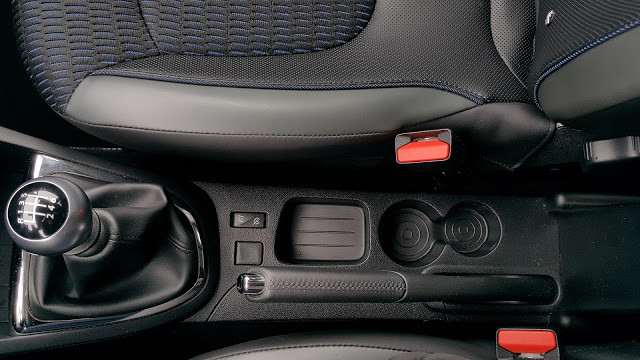 Tuż za skrzynią biegów znajdziemy przyciski od sterowania tempomatem oraz mocno zmieniający pracę silnika przycisk ECO. Mocno ponieważ gdy tylko go wciśniemy to auto momentalnie traci moc i spadają osiągi... ale jak ktoś kocha ekologię bardzo mocno to czemu nie. Nieco dalej obok hamulca ręcznego niewielkich rozmiarów skrytka oraz miejsce na kubki.