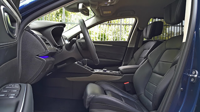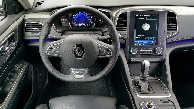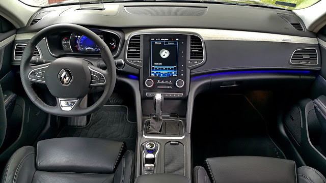 Deska rozdzielcza jest przesiąknięta elektroniką. Widoczne podświetlenie może być konfigurowalne jak to już w nowych Renault bywa. Pisałem już o tym w teście Talismana sedan tutaj, gdzie także możecie poczytać o konfiguracji ekranu znajdującego się za wieńcem kierownicy i innych multimediach. Osobiście zawsze ustawiam niebieski kolor bo po pierwsze najbardziej mi się podoba, a po drugie jest on najmniej męczący dla oczu, zwłaszcza w nocy. Jak zawsze jedyną rzecz którą bym zmienił albo zamienił to ustawianie siły nawiewu. Pod pokrętłami jest zakres temperatury a smyrając palcem po ekranie ustawiamy siłę nawiewu - wolałbym odwrotnie chociaż można się do tego przyzwyczaić.