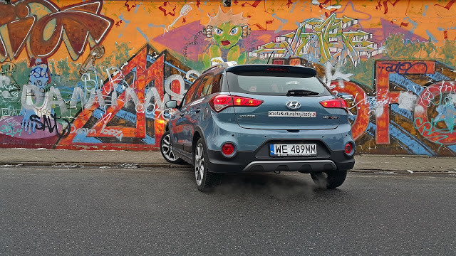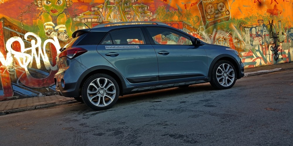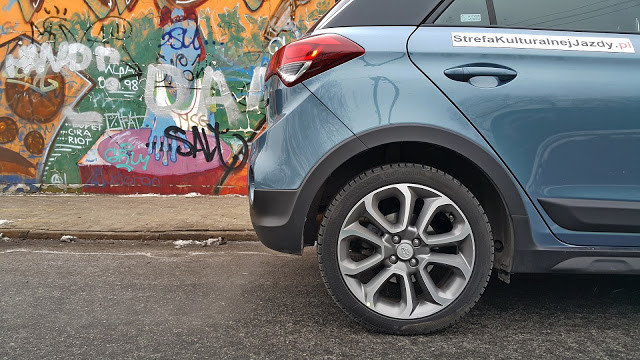 Pierwsze co się rzuca w oczy to jak zawsze felgi i kolor nadwozia - obie te rzeczy w testówce prezentowały się więcej niż tylko przyzwoicie. Przy nadkolach mamy plastikowe nakładki, które optycznie dość mocno to małe auto powiększają. Przedni oraz tylny zderzak także delikatnie jest zmieniony w stosunku do zwykłego Hyundai`ja i20. Generalnie bryła auta należy raczej do kategorii ,,atrakcyjne".