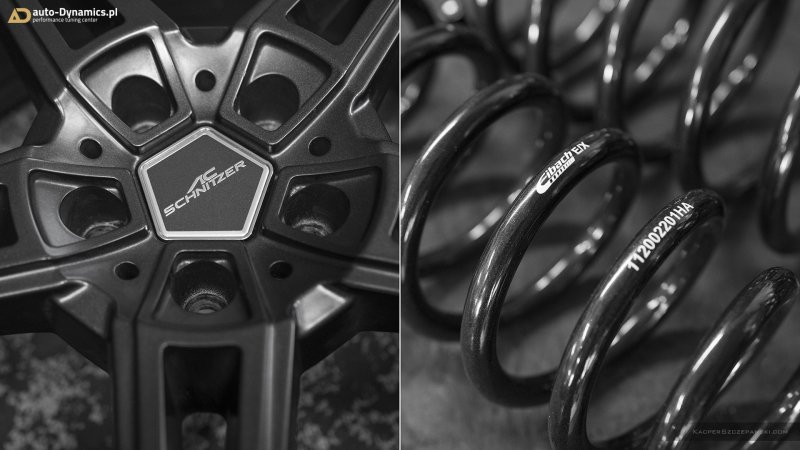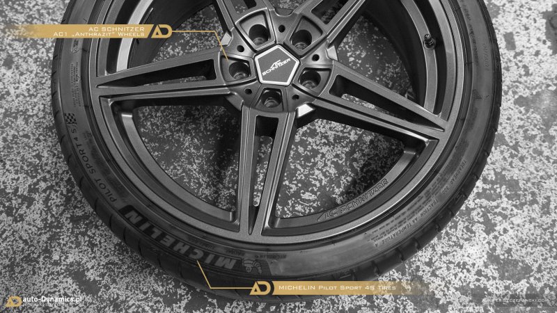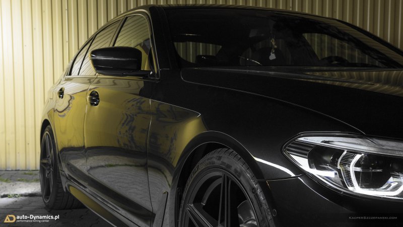 Dynamizację perspektywy stylistyczno-wizualnej 5-er rozpoczęliśmy od eliminacji tak ochoczo i obligatoryjnie serwowanych przez BMW akcentów chromowanych. Pakiet kosmetyczny „Black” w przypadku ów konkretnego egzemplarza „Piątki”, zapewnił kompletny de-chrom akcentowym nakładkom wszystkich czterech klamek drzwi oraz trapezoidalnym końcówkom układu wydechowego, czyniąc tym samym harmonię z oem’owym zestawem „Shadow Line” w koherentnym, ciemnym i energicznym stylu. Druga faza prac to modyfikacje w zakresie zawieszenia. Seryjne sprężyny ustąpiły miejsca ich sportowej odmianie o twardszej, lecz w dalszym ciągu dość komfortowej charakterystyce. Progresywny zestaw sportowych, usztywniających a zarazem obniżających sprężyn od renomowanego, niemieckiego producenta – firmy Eibach, prócz znacznej poprawy prowadzenia, obniżenia środka ciężkości i „czucia” pojazdu - dzięki obniżeniu [-30mm oś przednia i -30mm oś tylna] nadał G30 dużo atrakcyjniejszej aparycji przy jednoczesnym zachowaniu wygody podczas codziennej eksploatacji. Kolejny, de facto koronny „stage” krystalizujący w pełni zdefiniowany koncept – montaż nowego zestawu kół. Kompletacja pod postacią aluminiowych, 20 calowych felg firmy AC Schnitzer, model AC1 w wersji kolorystycznej „Anthrazit” o specyfikacji: 8,5” dla osi przedniej oraz 10” dla osi tylnej. Naturalnie, wraz z adekwatnym zestawem montażowym który to, w fuzji z sprężynami Eibach, idealnie wpisał osadzenie felg w linię błotników. Felgi wyposażone zostały w zestaw sportowych opon klasy high-performance – francuskiej firmy Michelin. Nie mający sobie równych, absolutnie topowy model – Pilot Sport 4S [FA: 245/35/19 | RA: 275/30/20] oraz w pakiet nowych, OEM’owych [BMW] czujników kontroli ciśnienia w oponach [TPMS / RDCI], które własnym sumptem, metodą proszkową wylakierowaliśmy w satynowym kolorze obręczy AC Schnitzer.