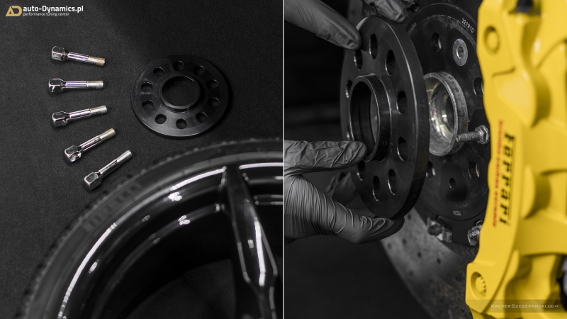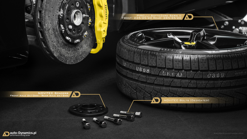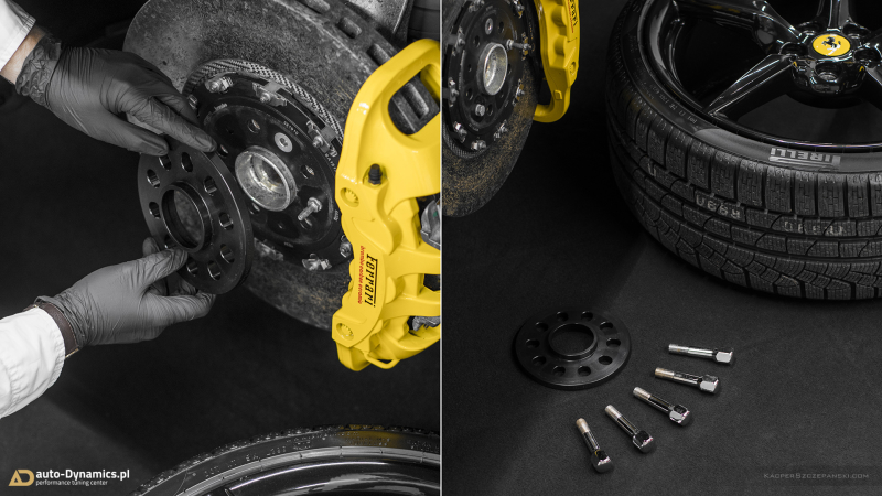 „Cavallo” podczas drugiego etapu prac wyposażyliśmy w zestaw sportowo zorientowanych, zimowych opon klasy high-performance – włoskiej firmy Pirelli. Nie mający sobie równych, absolutnie topowy model - SottoZero Serie II [235/35/20 przód oraz 285/35/20 tył]. Celem maksymalnego wyeskalowania aspektów wizualnych fabrycznych felg jak i nadania jeszcze wyższej stabilności – w 488 GTB zainstalowany został zestaw aluminiowych dystansów poszerzających [niemieckiej firmy Novitec] wraz z kompletem adekwatnie dłuższych śrub. Montaż pierścieni dystansujących pozwolił zrównać felgi z linią błotnika i idealnie wypełnić nadkola – czyniąc odbiór bryły pojazdu jeszcze bardziej spójnym i agresywnym.