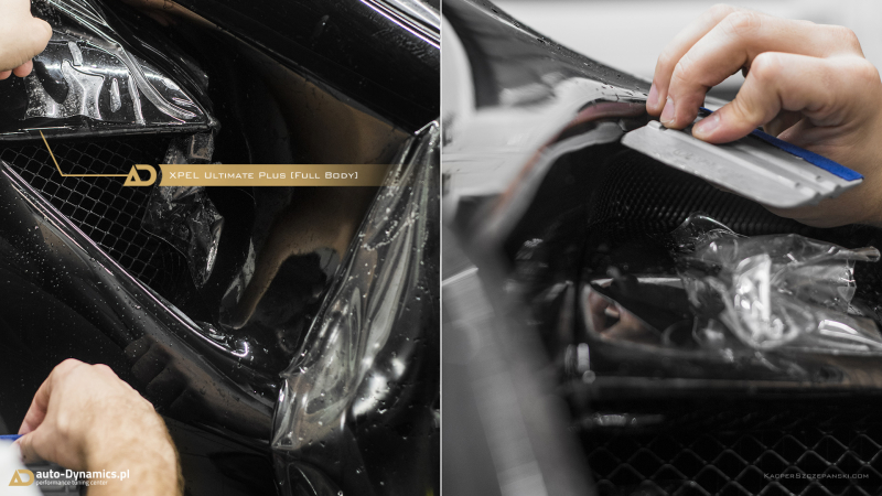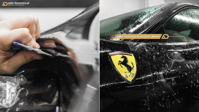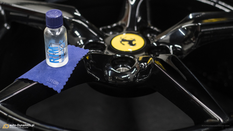 Pierwsza faza działań nad „Cavallo” to pełna koncentracja przy szerokim spectrum prac związanych z skomasowaną paletą zabezpieczająco-ochronnego arsenału. Bezpieczne, detailngowe mycie z troską i dbałością o każdy szczegół oraz detal, pieczołowita, arcy-drobiazgowa korekta lakieru – to jedynie wstęp do szerokiego wachlarzu wykonanych czynności. 488 GTB po uwzględnieniu wszystkich, rygorystycznych inicjujących procedur otrzymało na całą karoserie folię bezbarwną o właściwościach samoregenerujących z serii Ultimate Plus od renomowanej firmy XPEL. Całe nadwozie zostało oklejone bez użycia jakichkolwiek szablonów – celem ukrycia wszelkich możliwych łączeń. Chirurgiczna precyzja w aplikacji pozwoliła na bez marginesowe zamaskowanie PPF [Paint Protection Film] pod wszystkie emblematy, uszczelki oraz krawędzie. Starannie, na całość folii bezbarwnej naniesiona została dodatkowo powłoka ceramiczna marki Gyeon. Konsekwentnie ceramiką zabezpieczone zostały również wszystkie szyby oraz przeźroczysta pokrywa silnika jak również felgi [produkty z palety Gyeon]. Staranność i metodyczność naszego stylu pracy nie pozwoliły na pominięcie przestrzeni wewnętrznej Ferrari. Cały przedział pasażerski [tekstylia, skóry, alcantara] i wszystkie elementy wnętrza, po ówczesnym, specjalistycznym, detailingowym oczyszczeniu zostały skrupulatnie zaimpregnowane powłokami hydrofobowymi [Gyeon].
