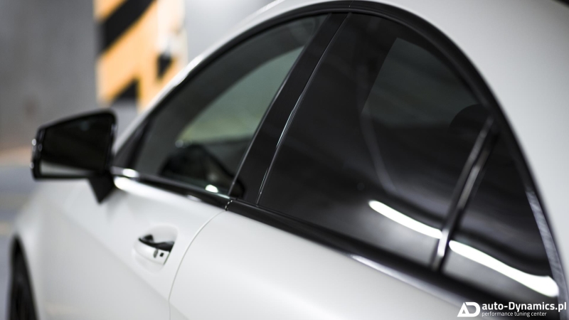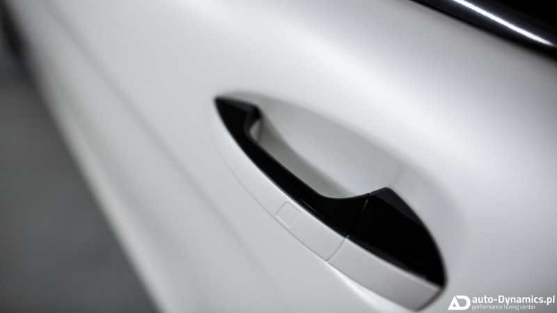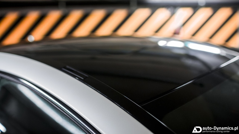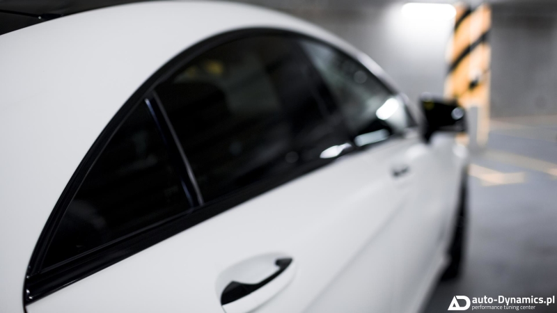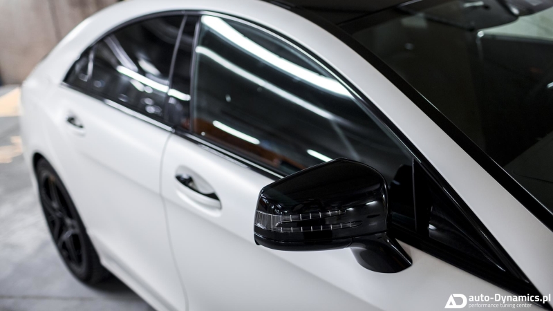 W pierwszym etapie całość prac skoncentrowaliśmy na poprawie stylistyki CLS’a. Zgodnie z wytycznymi Klienta pojazd został oklejony folią wylewaną Ultimate Premium Plus renomowanej firmy SOTT w ultra modnym kolorze - White Satin Pearl. Celem nadania odpowiedniego kontrastu i osiągnięcia spójności projektu poszycie dachu jak i chromowane listwy wokół okien oklejone zostały folią w kolorze czarnego połysku. Przednia atrapa chłodnych – grill, dyfuzor zderzaka tylnego, obudowy lusterek zewnętrznych, emblematy i końcówki układu wydechowego wylakierowane zostały w kolorze czarnym. Dopełniacz stylistycznych zmian to spoiler zdobiący pokrywę maski bagażnika od renomowanego, niemieckiego producenta – firmy Väth który wykończony został w identycznym jak pozostałe akcenty kolorze.