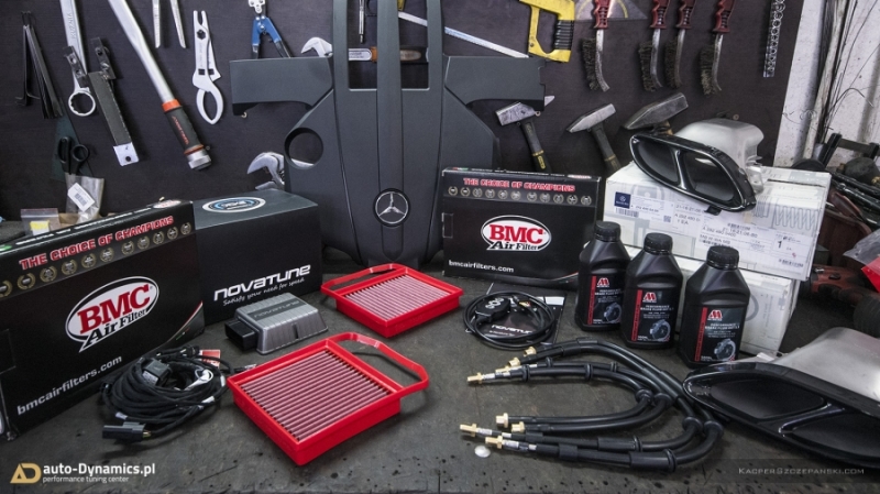 Wykorzystując potencjał przeprowadzonych modyfikacji mechanicznych, W Mercedes-Benz z racji obowiązującej gwarancji, zainstalowany został profesjonalny, w pełni cyfrowy, dedykowany, zewnętrzny komputer ECU wraz z specjalną, rozbudowaną wiązką elektroniczną komunikującą się z sensorami magistrali CAN. Kontroler od renomowanego, niemieckiego producenta - firmy Novatune. ECU zapewnia osiągi i bezpieczeństwo identyczne do typowego chiptuningu przez OBD. Moduł korzysta z map z dynamiczną adaptacją - monitoruje wiele wartości w czasie rzeczywistym i elastycznie dobiera wskazania. Ponadto w pojeździe zainstalowany został, w pełni programowalny akcelerator przyspieszenia zmieniający charakterystykę pracy pedału na bardziej agresywną [produkt niemieckiej firmy – Novatune]. Właściwości fabryczne podane przez MB to: 333KM i 480Nm [Wyniki pomiaru seryjnych wartości to 335KM i 441Nm]. Efekty naszego zabiegu zmierzone na hamowni to 402KM i 551Nm [Przyrost +67KM i +110Nm]. Wzrost parametrów na tym poziomie zapewnia absolutną bezawaryjność jednostki napędowej w połączeniu z rewelacyjnymi osiągami pozwalającymi na bezpieczne wyprzedzanie w każdych okolicznościach i warunkach drogowych. Odczucia z jazdy w połączeniu z napędem na obie osie są teraz naprawdę niesamowite, a elastyczność zdumiewa na każdym biegu!