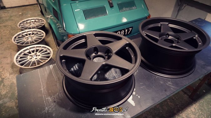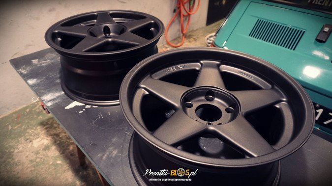 Wracając jednak do Prentkich AZEV-ów – nad kolorem myślałem długo, ale ostatecznie zdecydowałem się na czarną satynę. Raz, bo jest to kolor na tyle uniwersalny, że obcierki i uszkodzenia (a z moim podejściem zapewne będzie ich sporo) da się zamaskować zwykłą farbą do malowania kominków. Po drugie, czary mat powinien dobrze zagrać z matowym nadwoziem. No i nie będzie się tak łatwo brudził (a to dość istotny problem przy nacinanych tarczach i sporej ilości krętych dróg).