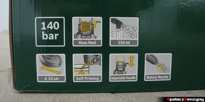 Podstawowe funkcjonalności myjki wyszczególnione na opakowaniu to 140 barów maksymalnego ciśnienia, zwijany długi 8-metrowy przewód wysokociśnieniowy, pianownica, przystawka do mycia tarasów (bardzo fajna), możliwość zasysania wody z otwartych zbiorników (np. deszczówki), teleskopowy uchwyt (myjka ma kółka), dysza rotacyjna (2 sztuki w zestawie).