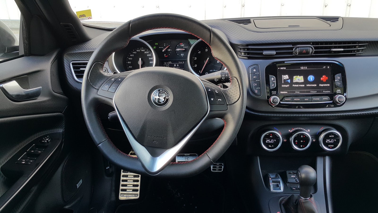 Zegary analogowe, duże i czytelne. Przyzwyczajony jestem, że prędkościomierz mam z prawej a obrotomierz z lewej. W Alfie jest jednak odwrotnie, ale gdy zaczynamy bawić się łopatkami to uświadamiamy sobie, że ma to sens:) Zwróćcie uwagę na to w jaki sposób komputer pokazuje spalanie. W km/l czyli na pierwszy rzut oka wygląda to mega eco, ale jak już sobie przeliczymy to wracamy do normalności.