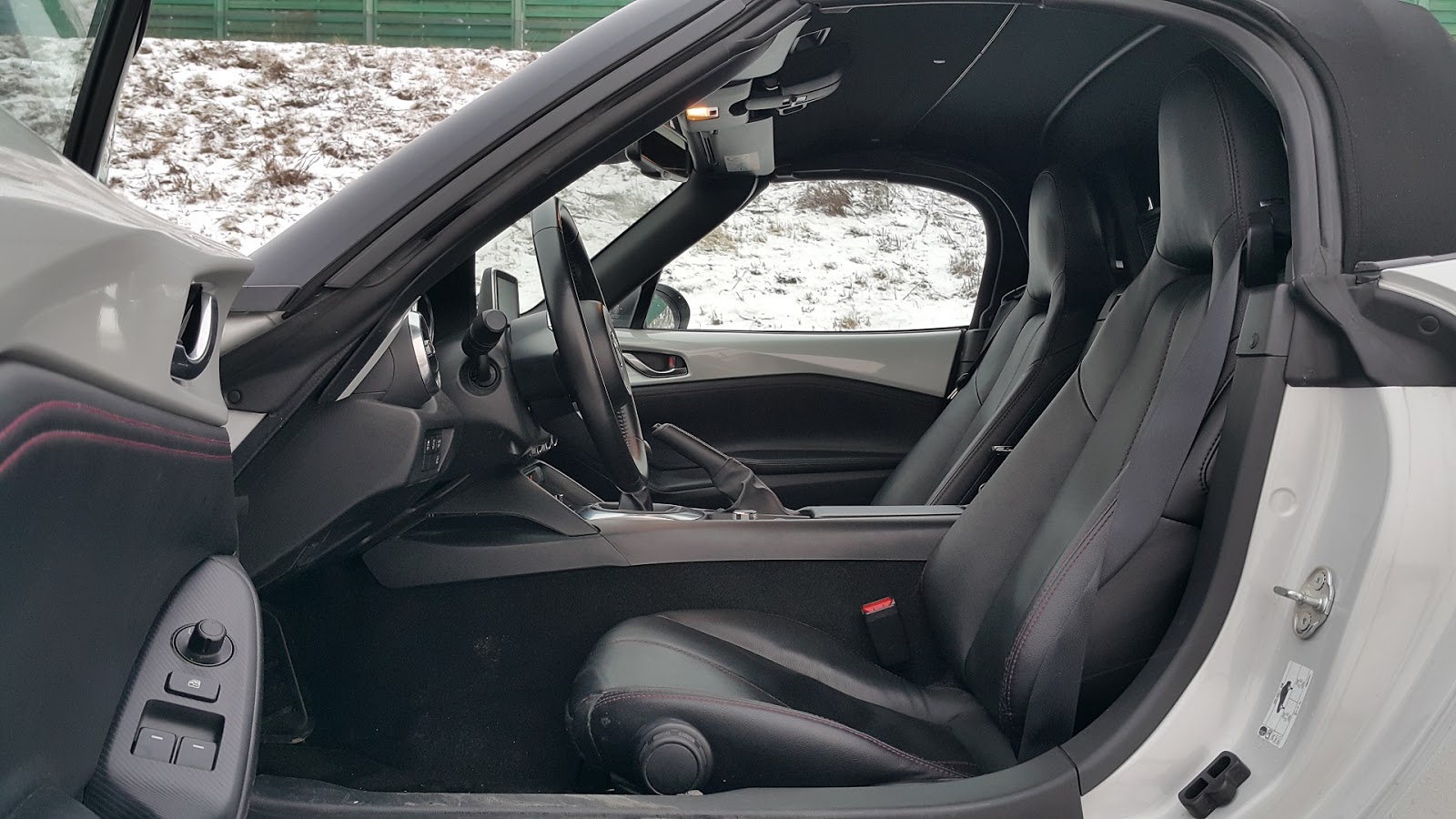 Fotele nie mają dużego zakresu regulacji. Oparcie jest jednak regulowane w wystarczającym zakresie. Fajnie również, że siedzisko posiada zakres regulacji na wysokość. Fotele bardzo sportowe, które może na to nie wyglądają, ale uwierzcie, że dość mocno trzymały moje cztery litery zwłaszcza w zakrętach. Siedzi się naprawdę glebowo, niemal, że na asfalcie z nogami prawie, że wyprostowanymi. Nie jestem małą osobą a w dodatku posiadam 185cm wzrostu i wydaje mi się, że jest to już górna granica wzrostu by jeździć ,,komfortowo" tym roadsterem. Oczywiście jeżeli ktoś ma 190cm to i tak się tam zmieści, ale przy zamkniętym dachu może mu być nieco niewygodnie.