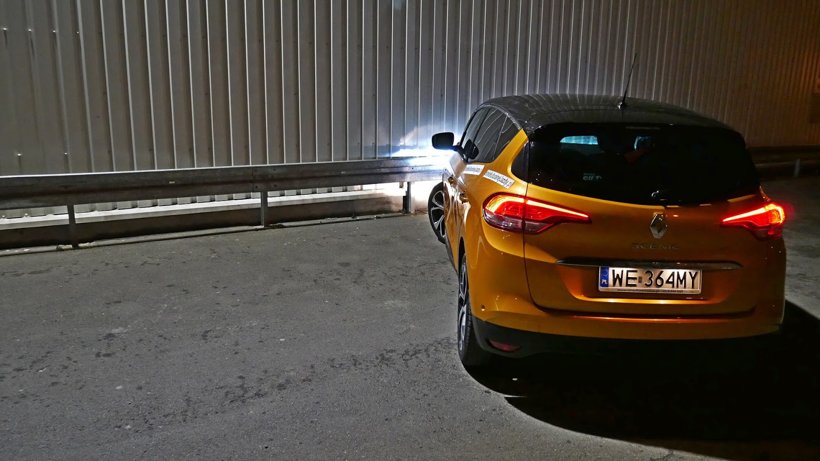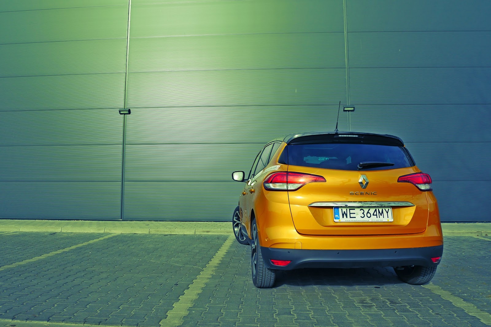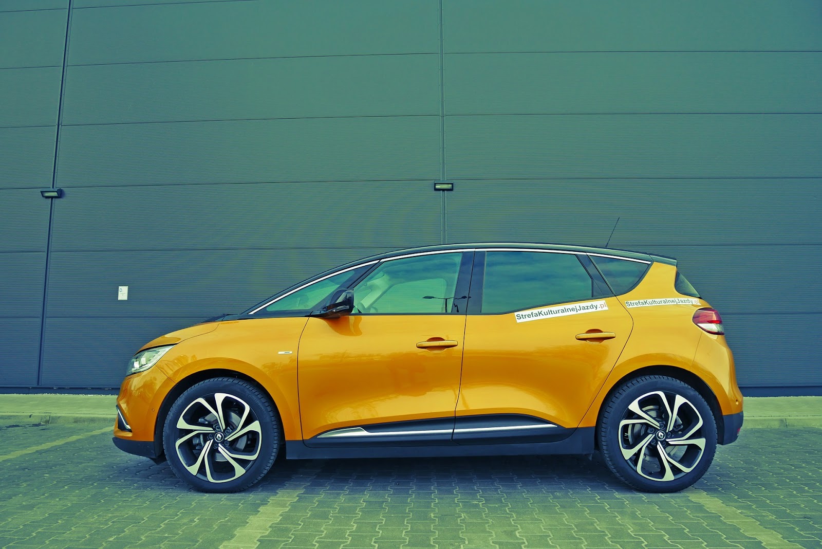 Na boku także coś tam z tej Cliówki jest. Dolny wybrzuszony próg, chromowana listwa, ale wystarczy już tych porównań. Dużą robotę robi testowa konfiguracja czyli nietuzinkowy kolor. Na aucie są zamontowane dość duże felgi o ciekawym wzornictwie.Jedyny dostępny rozmiar felg w Scenic to 20". Mimo wszystko profil opony nie jest niski co ma wpływ na komfort jazdy. Drugi argument jest pewnie taki, że łatwiej auto zestroić z jednym rozmiarem felg, choćby z dwudziestkami niż kilkoma innymi. Zawsze zawieszenie, prowadzenie będzie inne w zależności od rozmiaru alusa. W przypadkuRenault Scenic jest jedna opcja - albo dwadzieścia cali albo wcale. Mnie się ta opcja podoba. Góra auta w ciemnej tonacji. Ciemne duże okno dachowe z elektryczną roletą sprawia, że pojazd wydaje się być optycznie zglebiony.