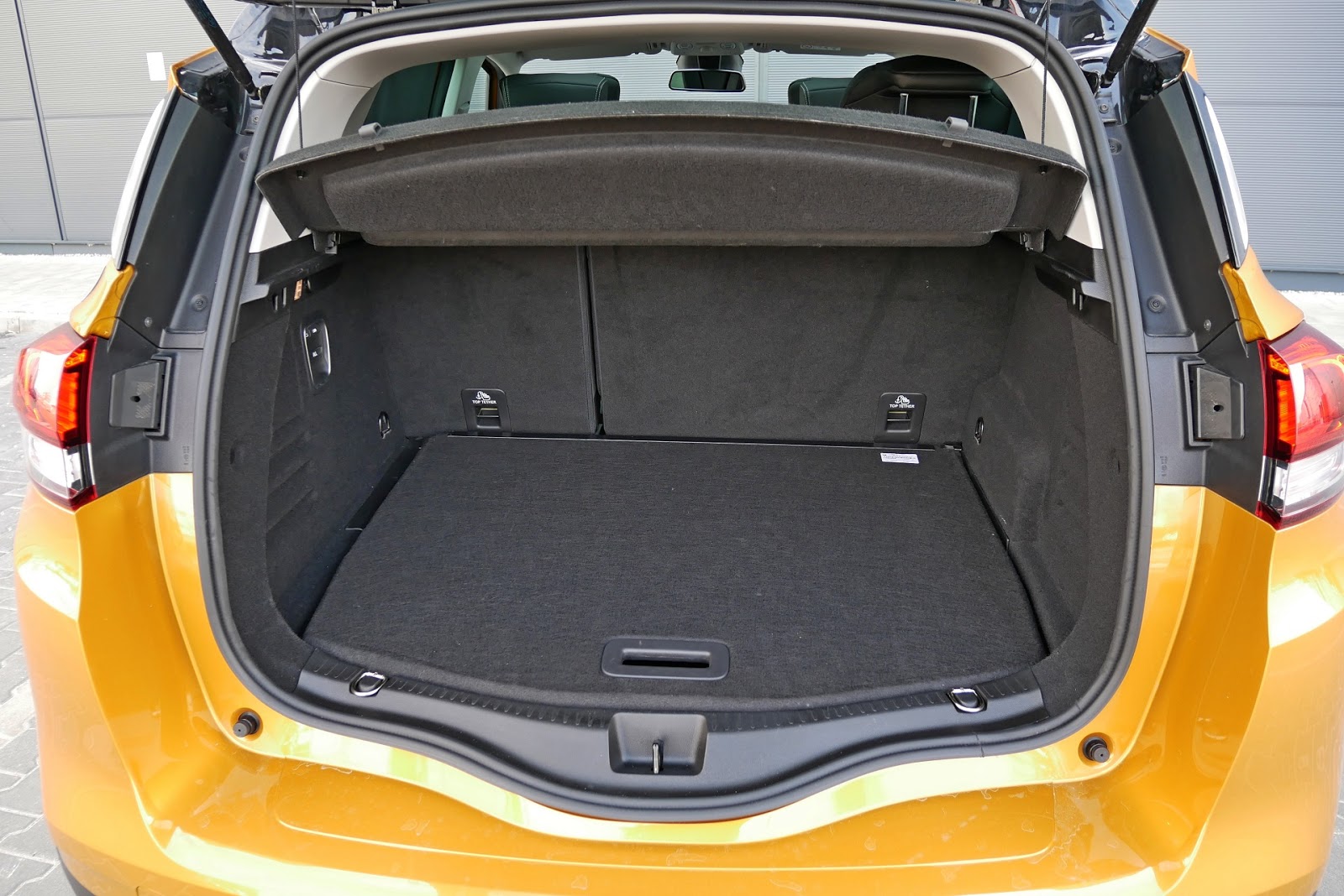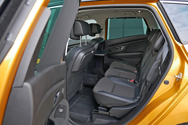 Bagażnik to sporych rozmiarów kufer, który posiada 572 litry pojemności przy płaskiej podłodze pod którą możemy znaleźć ekstra koło. Testowany Scenic był wyposażony w funkcję One Touch Folding, czyli z lewej strony tuż obok źródła światła i wyjścia 12V mamy przyciski odpowiadające za składanie oparcia tylnej kanapy, która jak już zwróciliście uwagę jest składana w systemie 2:1. Z jednej strony można by ponarzekać, że w I generacji każdy miał swój osobny fotel, a tutaj to tylko wygląda jakby tak było. Moim zdaniem wygodniejsze rozwiązanie gdyż osoba na środku siedzi wygodniej. Może to dziwne, ale jest tak gdyż w Scenicu I boki siedziska każdego fotela są bardzo twarde i gdy drugi rząd zajmują trzy rosłe osoby to jest już ciasno, średnio wygodnie.
