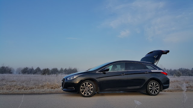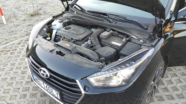 Silnik. Sercem kombiaka jest jednostka diesla o pojemności 1.7 CRDI. Do wyboru mamy wersję o mocy 115 lub 141 koni mechanicznych. Egzemplarz testowy jak się zapewne domyślacie posiadał mocniejszą odmianę. Do dyspozycji w i40 wagon było 340Nm dostępnych wprawdzie w wąskim zakresie między 1750 a 2500 rpm. Kombiak ze zdjęć nie został stworzony do rajdowej jazdy. Sprint do setki zajmuje dokładnie 11 sekund. Automatyczna, dwusprzęgłowa, 7-biegowa skrzynia biegów spisywała się bardzo dobrze. Jednostka wystarczająca do tego samochodu jeżeli oczywiście wolicie rozważną dynamikę zamiast sportowego szaleństwa. Może nie słabe, ale dobre osiągi rekompensuje w zupełności zużycie paliwa. Średnio auto spalało 5.5L/100km przy normalnej jeździe co uważam za więcej niż przyzwoity wynik. Uzupełnieniem ekonomi jest spory zbiornik paliwa o pojemności 70 litrów, który starczy na bardzo długo.