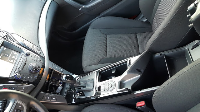 Czas na okolice skrzyni biegów. Znajdziemy tutaj wiele kolejnych udogodnień jak podłokietnik w którym jest dość pojemny podwójny schowek. Za przesuwaną roletą miejsce przeznaczone na napoje, a obok kilka przycisków. W dolnej części kokpitu jest czarny, połyskujący element, który po wciśnięci podnosi się do góry i ukazuje nam się kolejna skrytka z wyjściem 12V, AUX oraz USB - nawet sporej wielkości smartfon dość wygodnie się tam trzyma. Na szczęście ten czarny plastik jest na tyle dobrej jakości, że nie zostawia żadnych odcisków paluchów i raczej nie da się go łatwo zarysować. Materiały użyte do wykończenia deski rozdzielczej pochodzą z kategorii wysoka jakość.